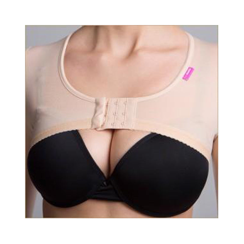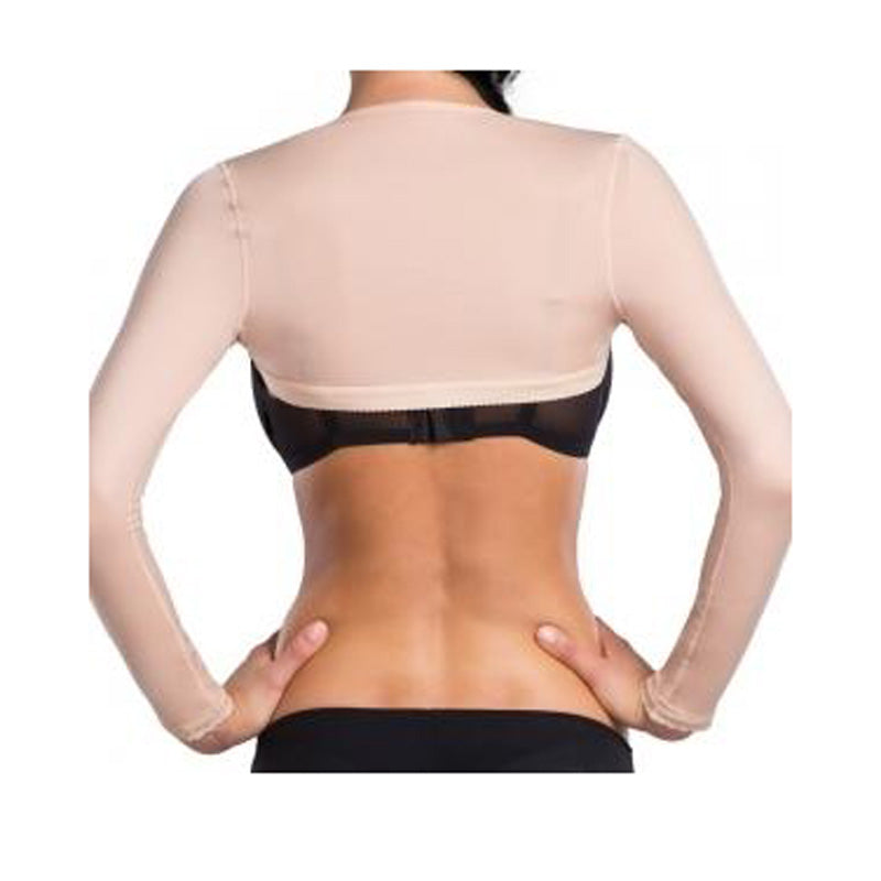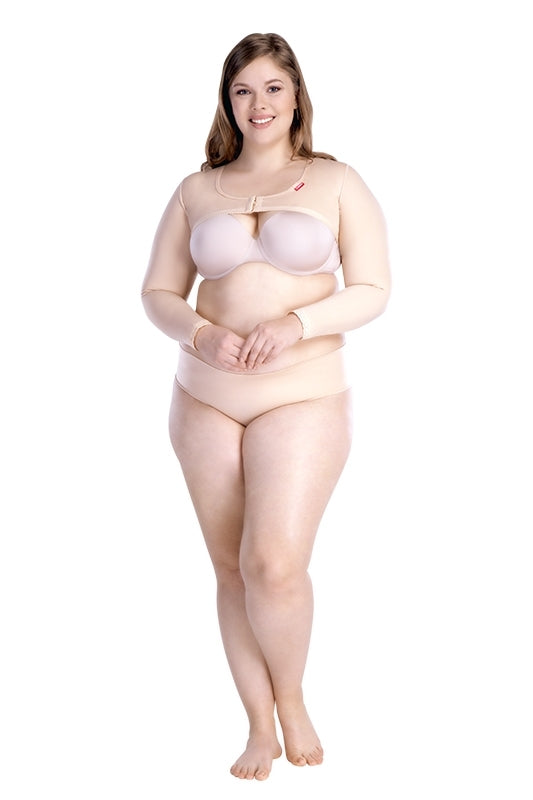 Post-operative compression arm long sleeve garment with three adjustable rows of hooks for the front closure for use after arm surgery, arm lifts (Brachioplasty), arm liposuction, or armpit surgery. The closure is located at the front part above the breast/chest. This garment covers the entire upper arms, underarms, lower arms, shoulders, and upper back. The sleeves are constructed with a delicate lace trim preventing them from chafing or rolling up. The AP Variant offers special padding foam in the armpit area, preventing any discomfort in this area. Compared to the AS Variant, the AP long Variant fasteners are in the front, and there is no adjustable silicone strap. Compared to AP Variant, this version has longer sleeves.