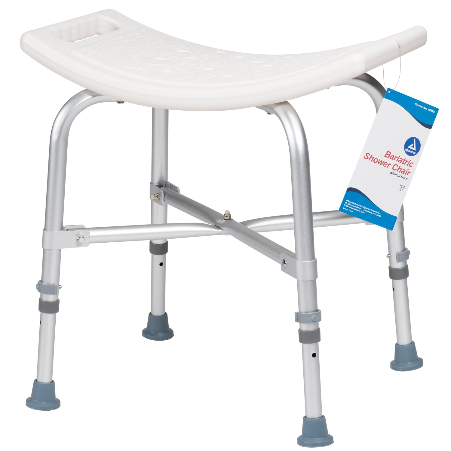 The Dynarex Bariatric Shower Chair without Back is made of durable blow-molded plastic, with a lightweight corrosion proof aluminum frame, complete with cross brace . This shower chair has angled legs that are easily assembled with a tool-free design, complete with rubber tips for added stability during use. The seat has holes to allow for drainage and built in handles to reduce the risk of slipping during use.