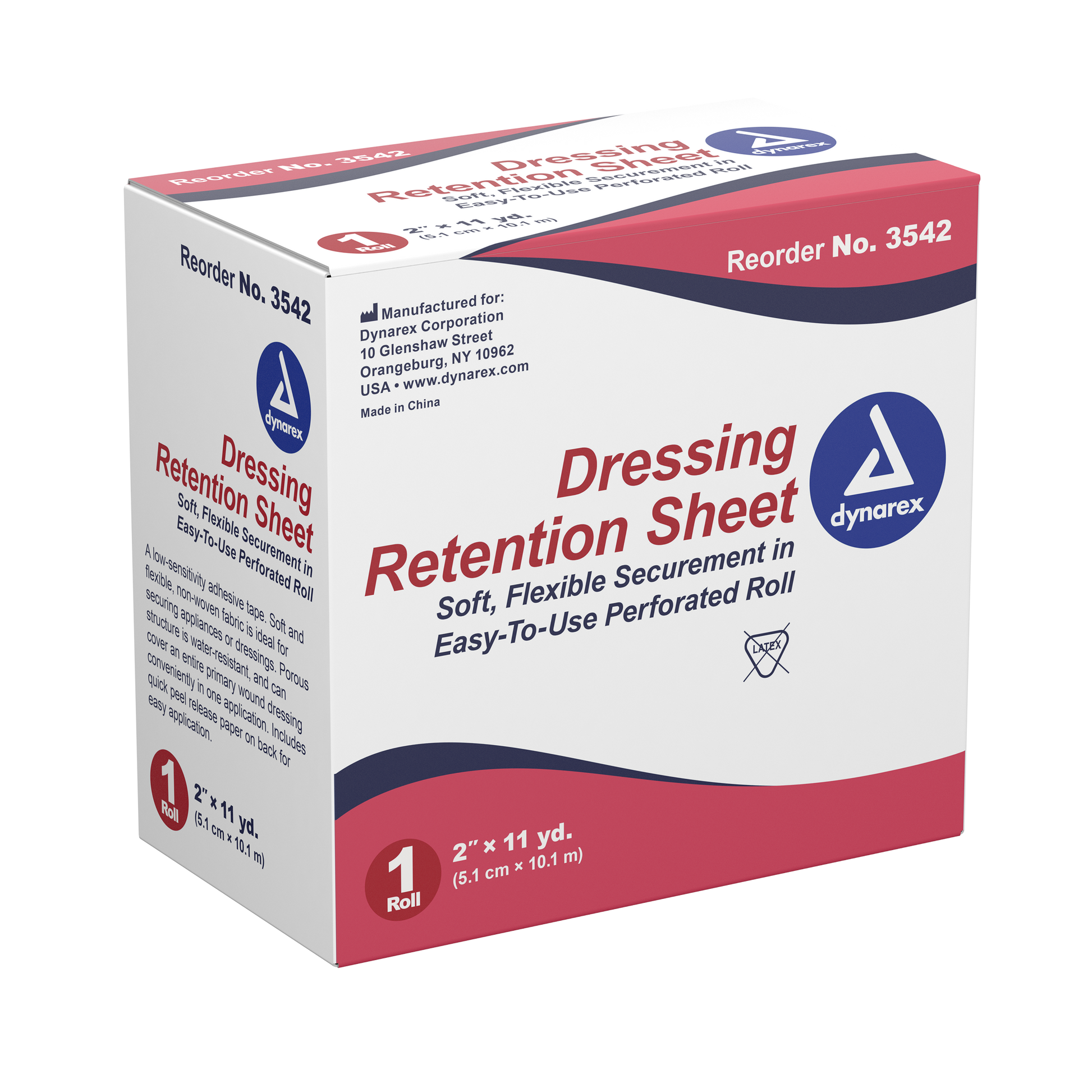 Dynarex Dressing Retention Sheets are made of soft, flexible non-woven fabric and low-sensitivity adhesive, ideal for securing dressings and appliances in a desired position. The Retention sheets are porous, yet water-resistant enabling it to cover an entire wound dressing in a one application.
