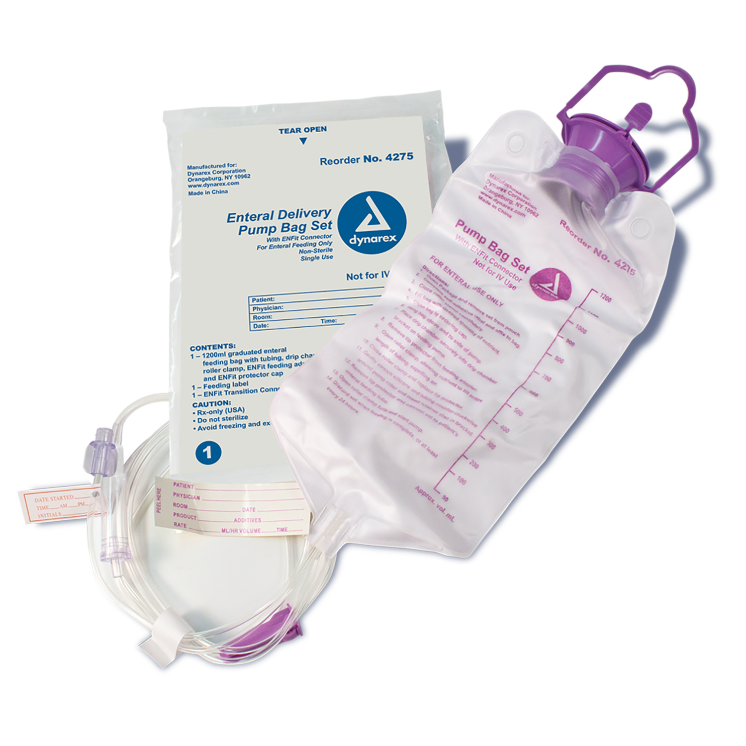 The Dynarex Enteral Delivery Gravity Bag Sets provide the components needed to open the nutritional bag, connect the tubing to the pump and the feeding set adapter to the feeding tube. Comes with transition connector.