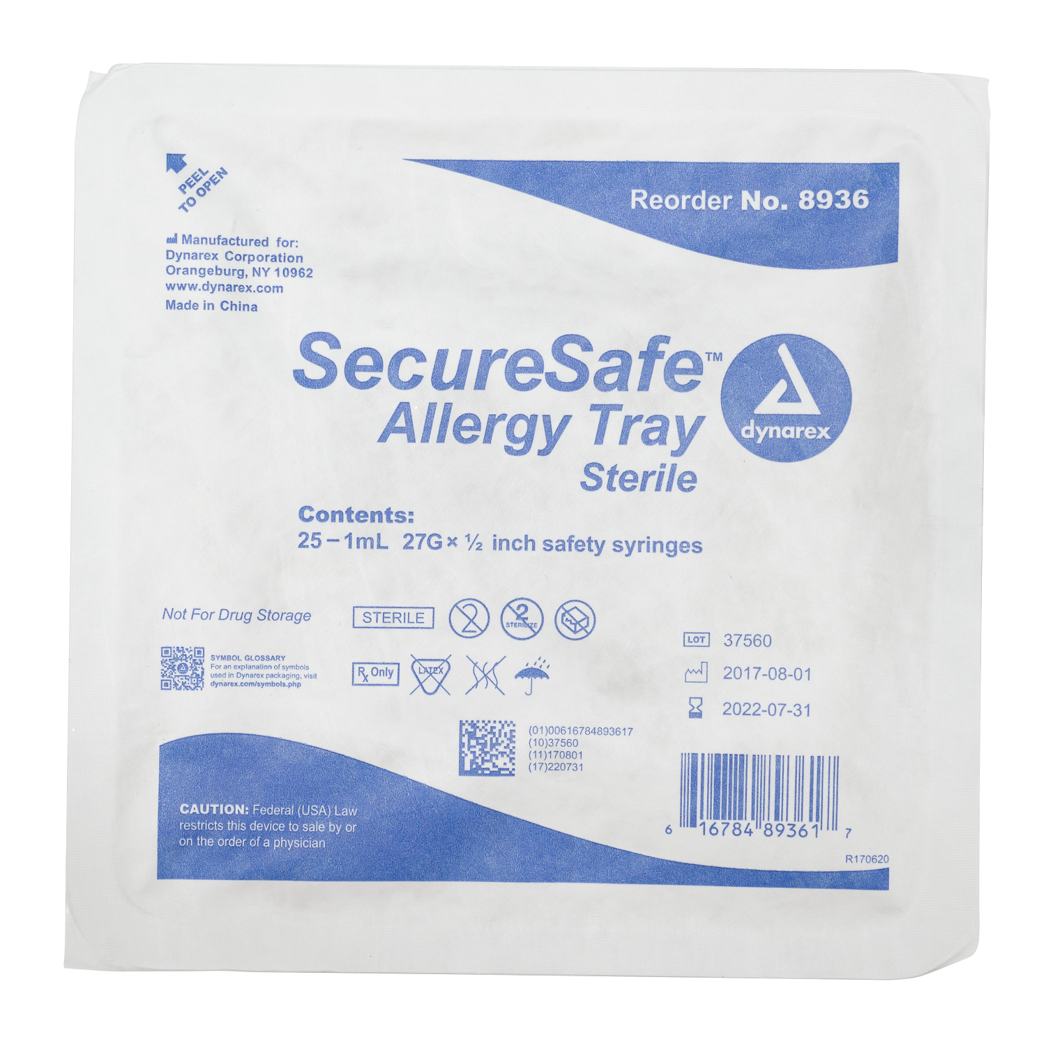 The Dynarex SecureSafe Allergy Safety Syringe Tray are designed with a safety engineered mechanism to provide a comfortable, effective way to deliver medication, while protecting the users from accidental needlesticks.