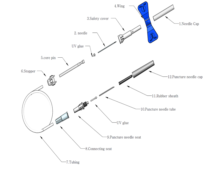 - Winged blood collection needle bonded to a flexible tubing with luer connector