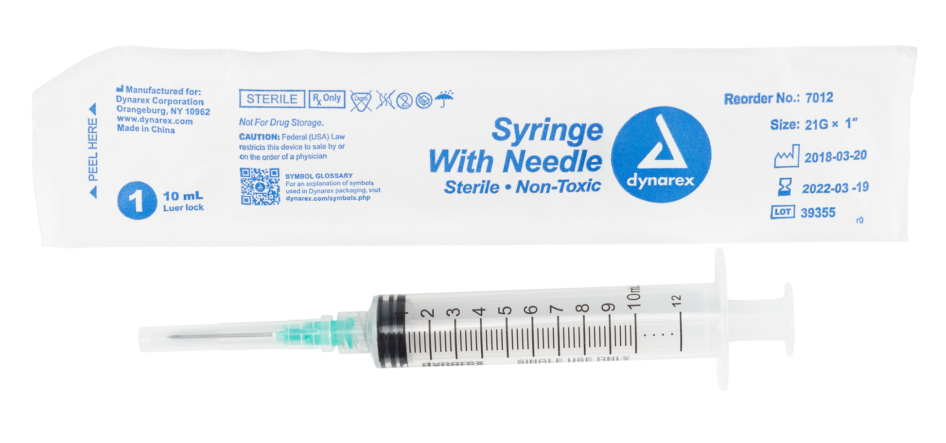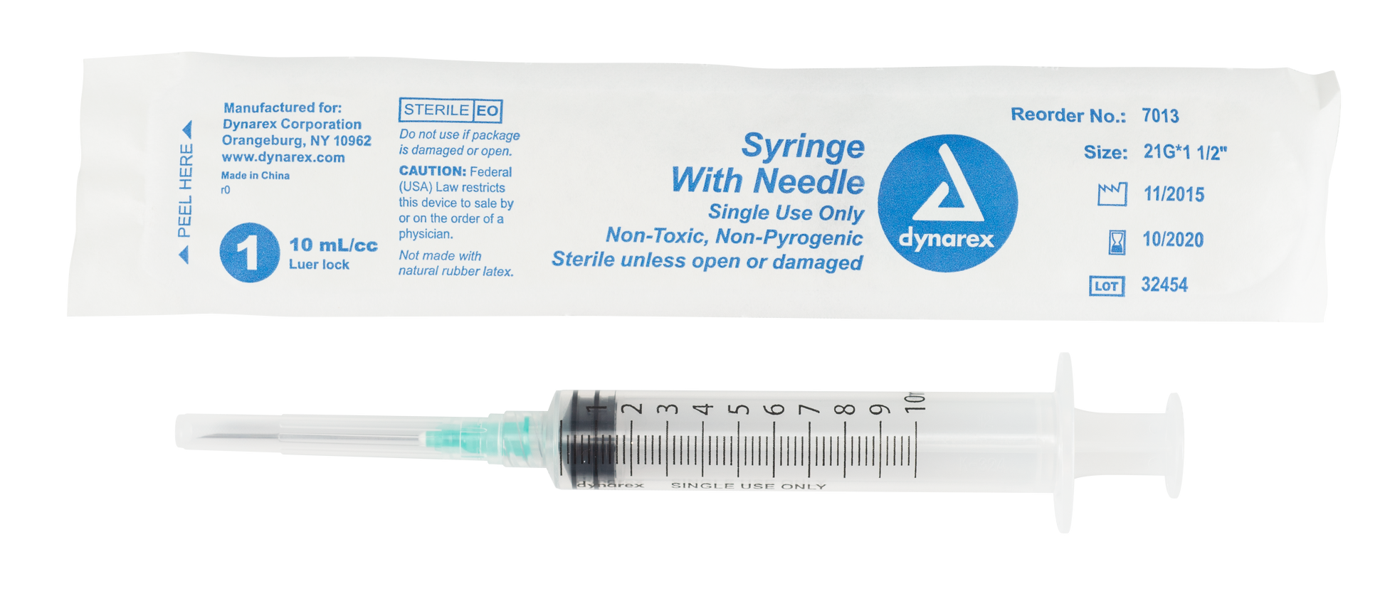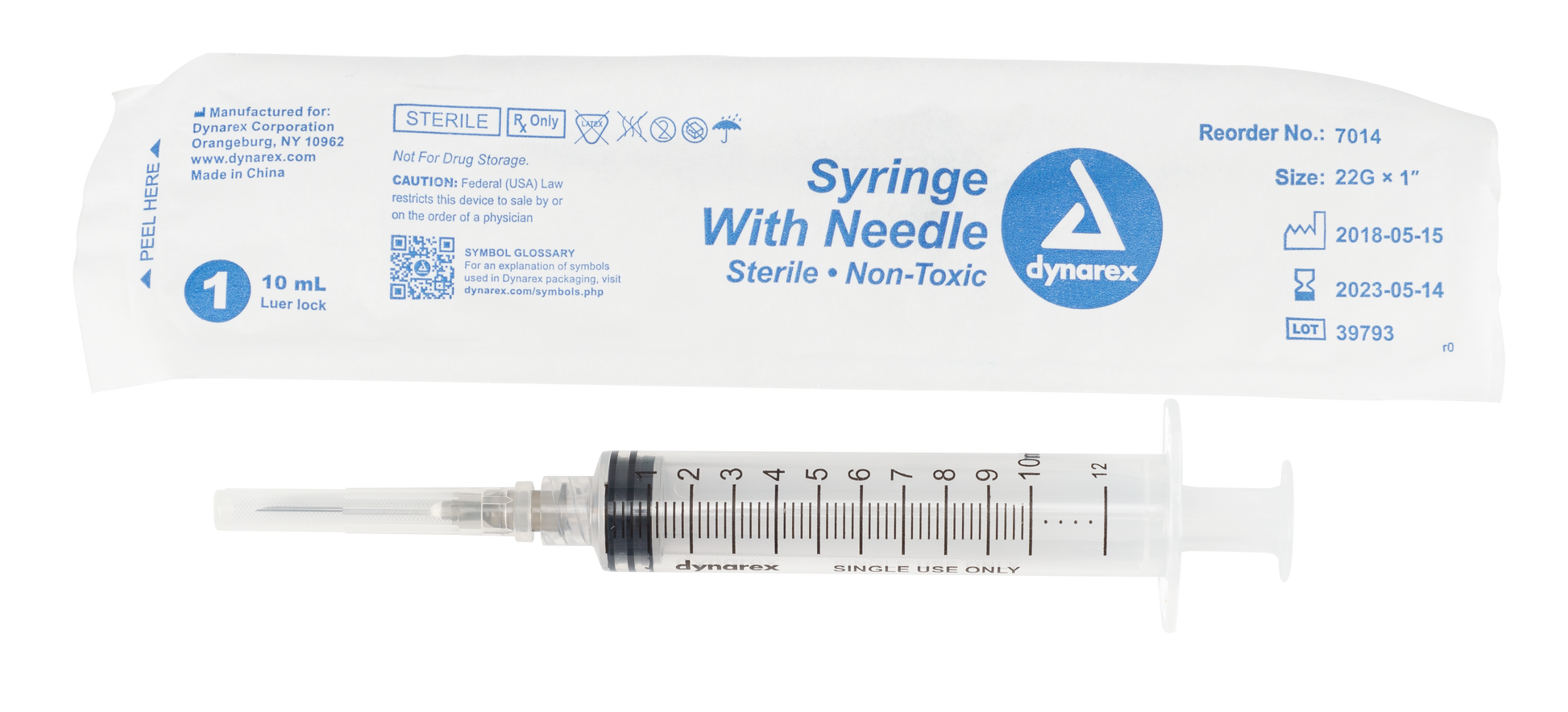The Dynarex Syringes with Needle are designed for comfortable injections. The thin wall needles have a double bevel, allowing for ease of penetration and a greater volume of fluid to pass. All needles are color coded to represent the gauge of the needle and attach to the syringe by either luer lock or luer slip connection.