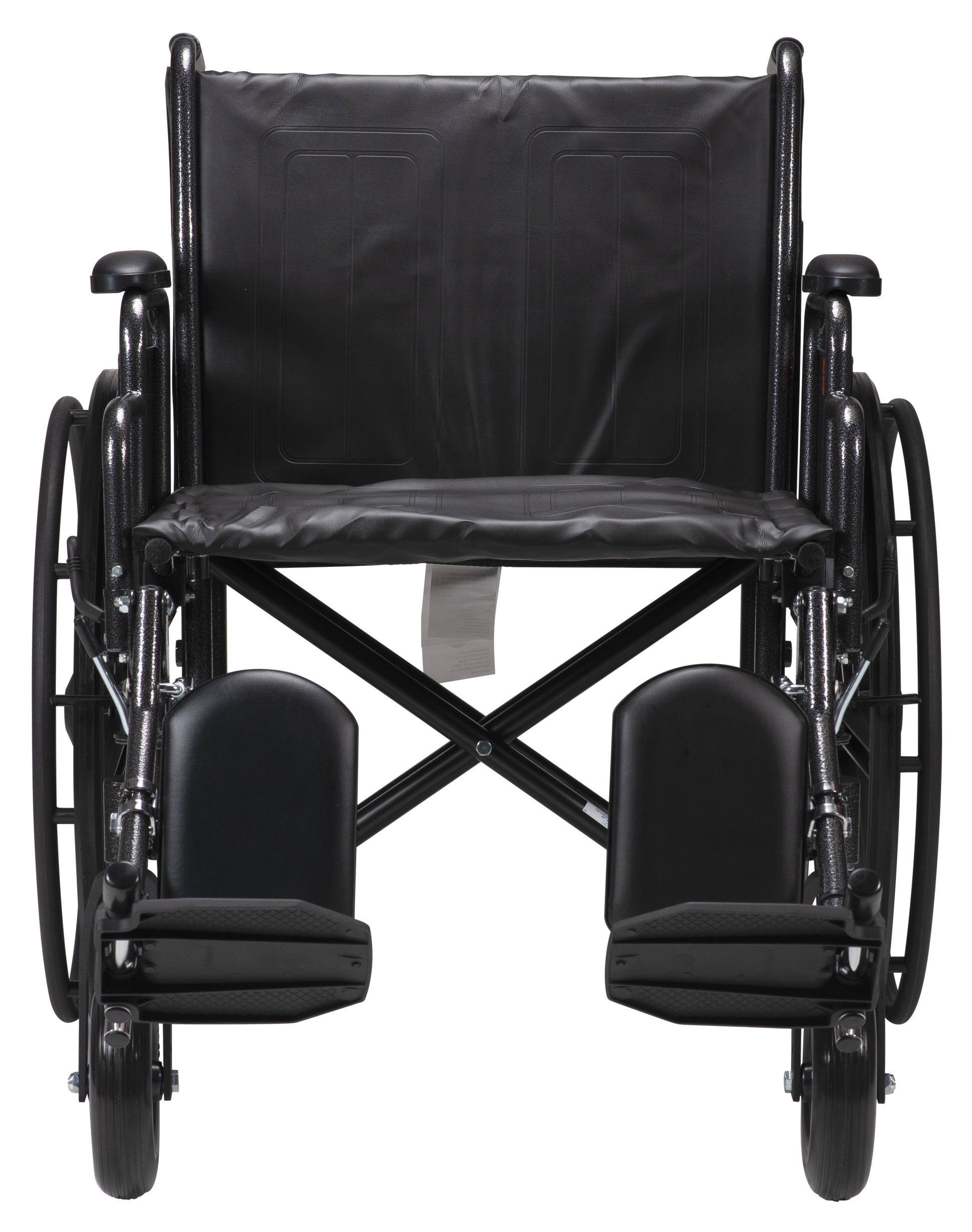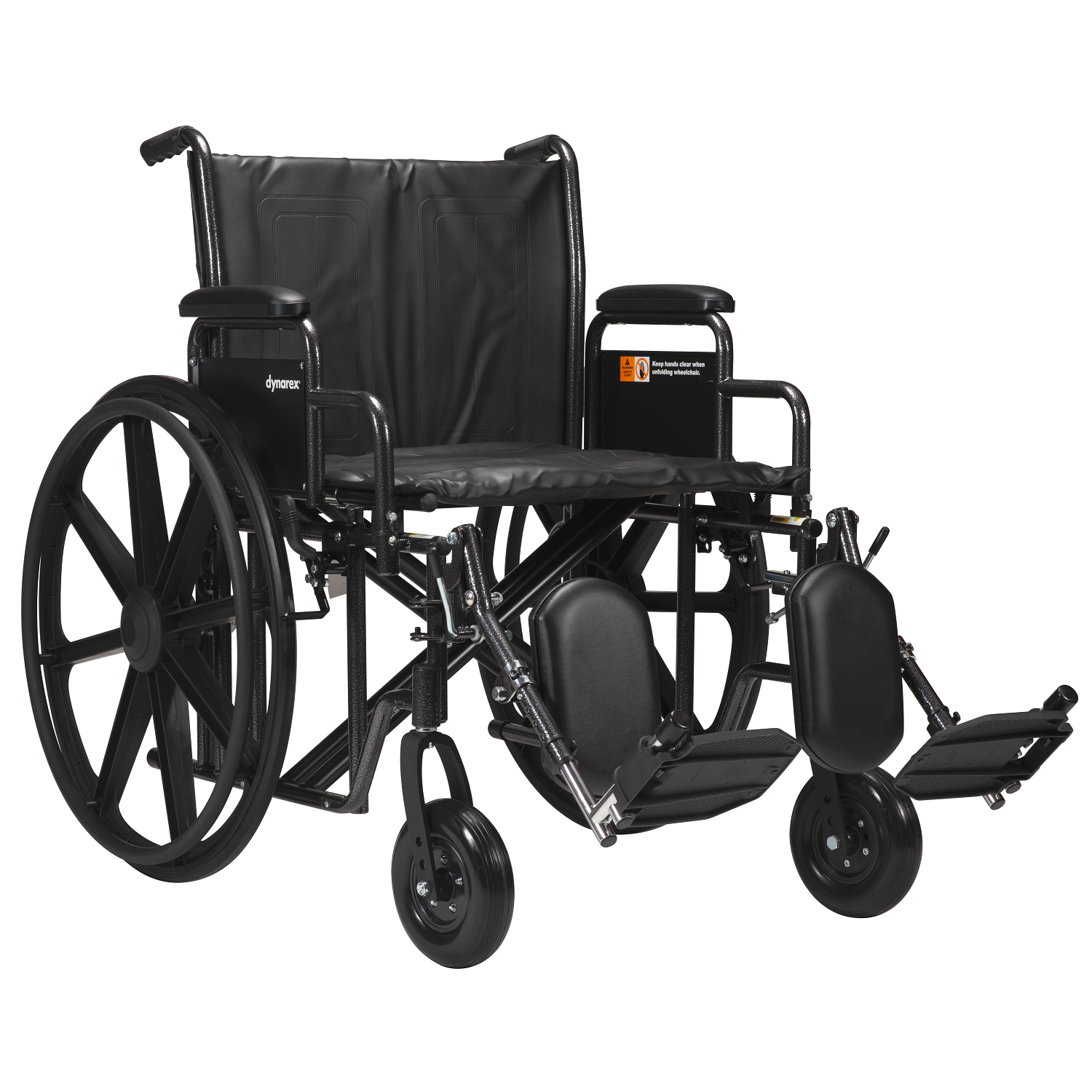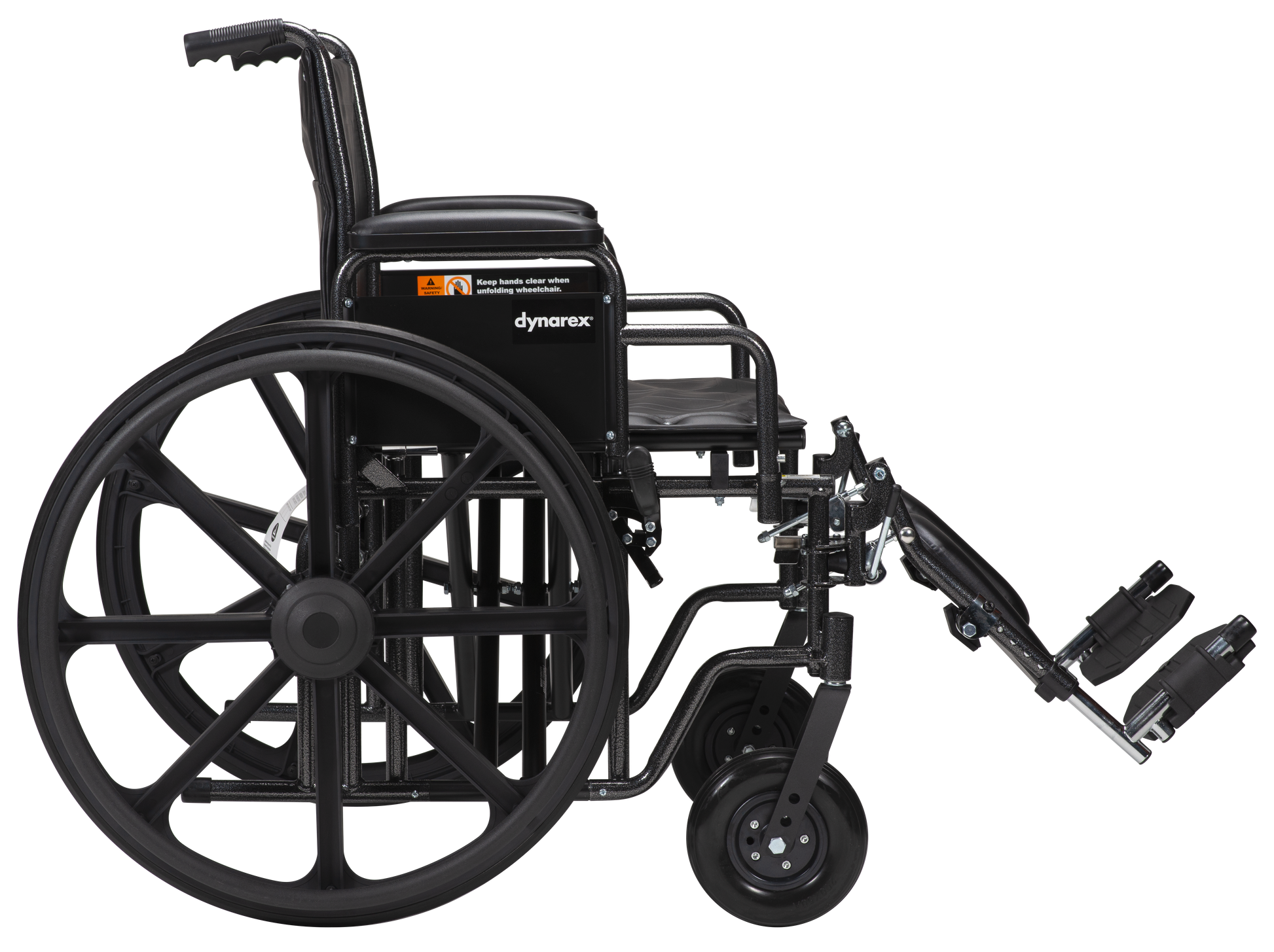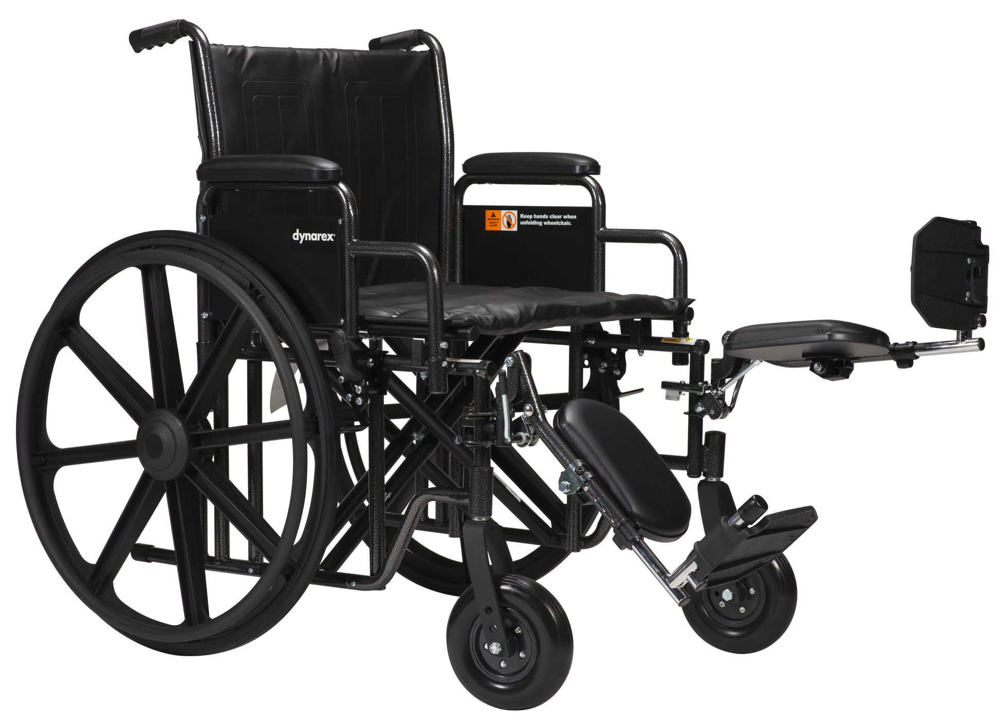 - Tool-free adjustable elevating leg rest with padded calf pads.