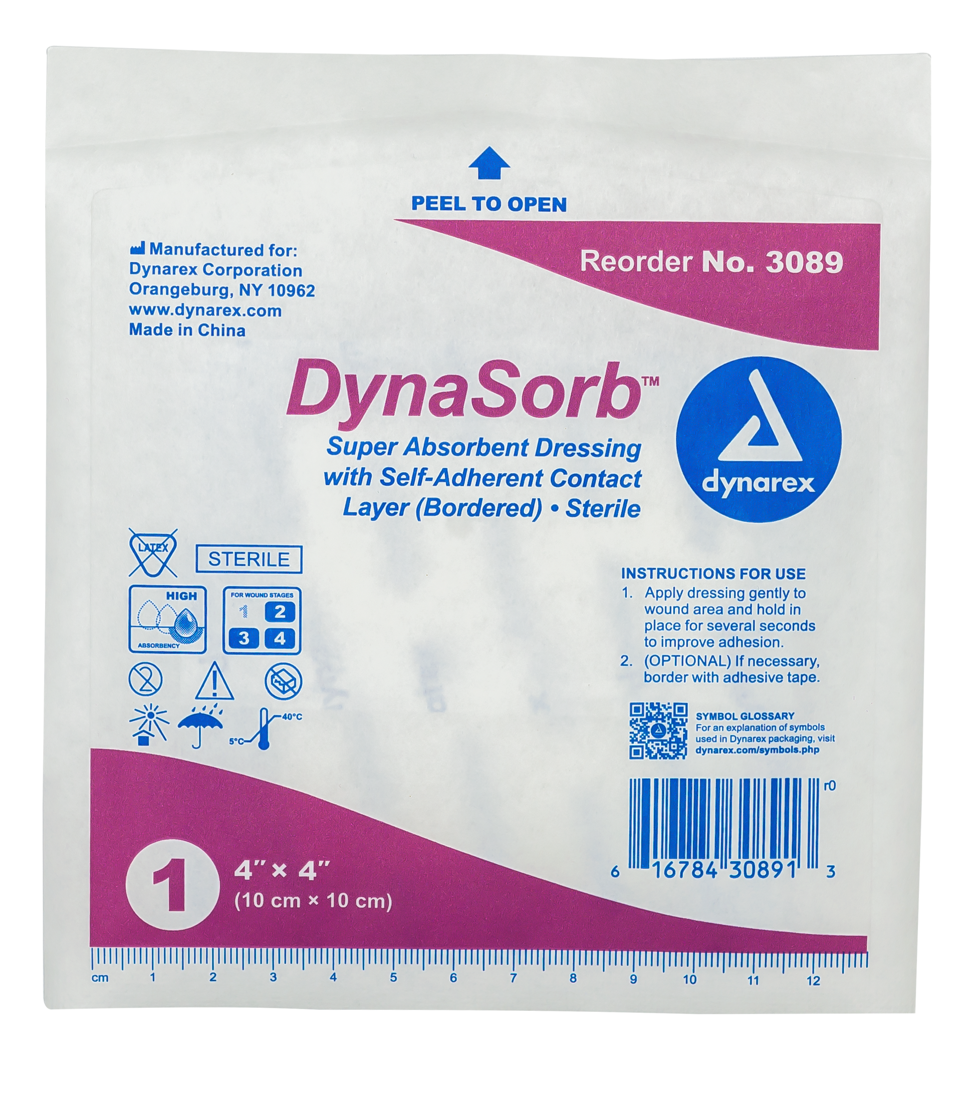 DynaSorb Super Absorbent Dressing is a multi-layered, one-piece dressing available as non-adherent or self-adherent with a contact layer and waterproof backing to prevent contamination. These dressings are constructed to facilitate the management of moderate to high levels of exudate to promote faster healing. The super absorbent core rapidly absorbs wound exudate, locking it away, minimizing risk of maceration while supporting a moist wound environment.