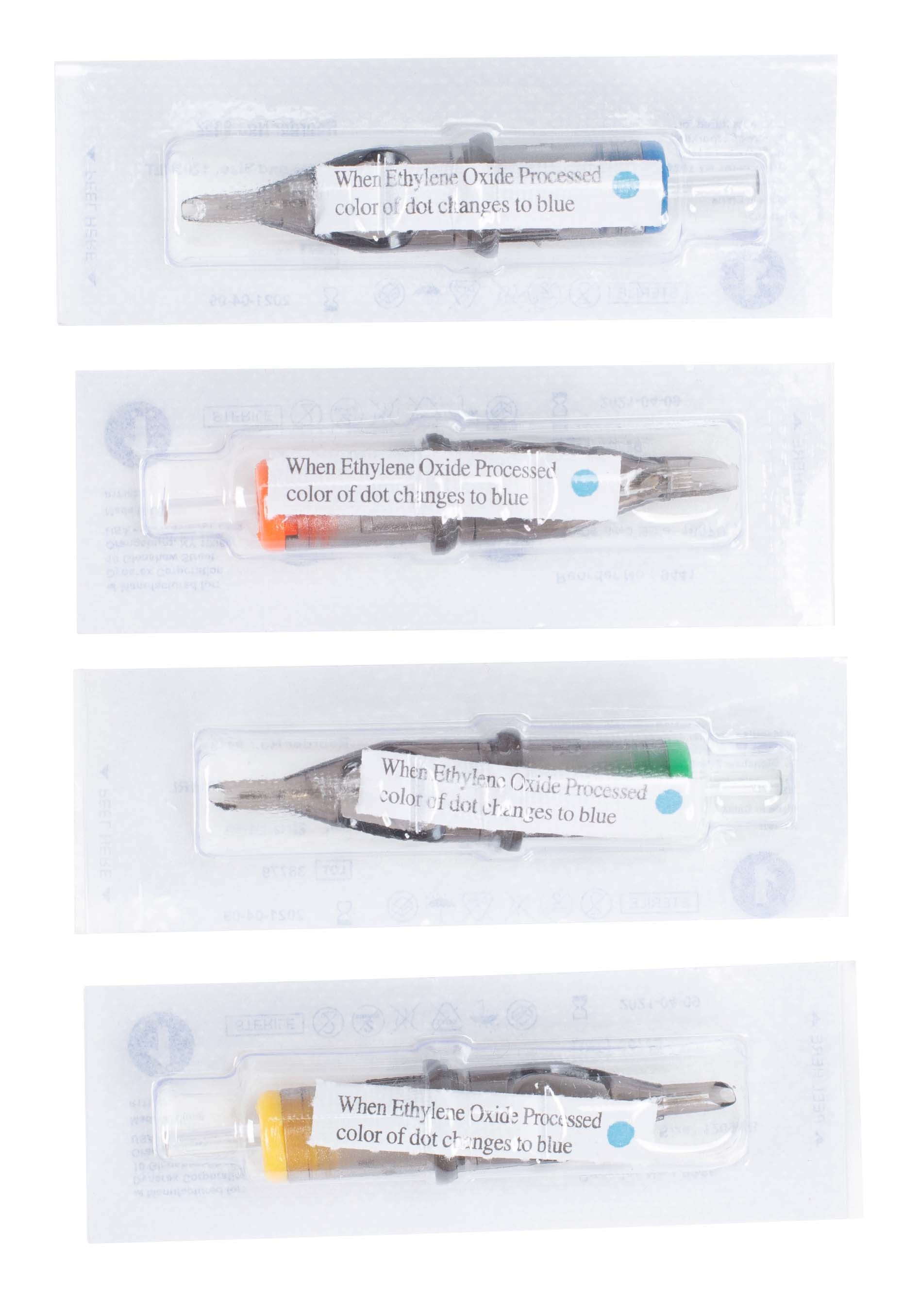 - Each needle cartridge is sterilized and individually wrapped in blister packs with an EO gas proof strip indicator