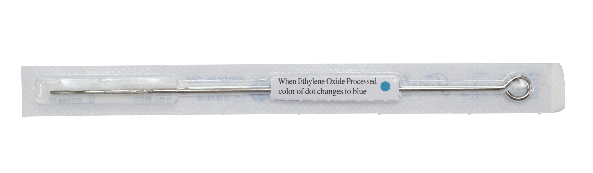 - Each needle is sterilized and individually wrapped in blister packs with an EO gas proof strip indicator.