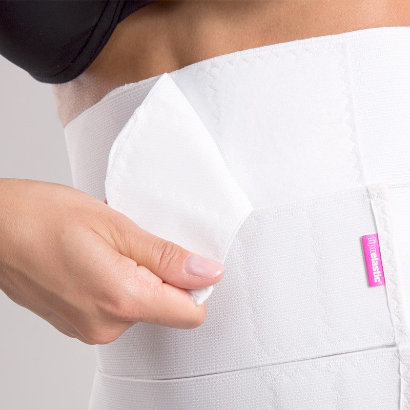 How to put on LIPOELASTIC abdominal belt together with a post-operative foam pad?