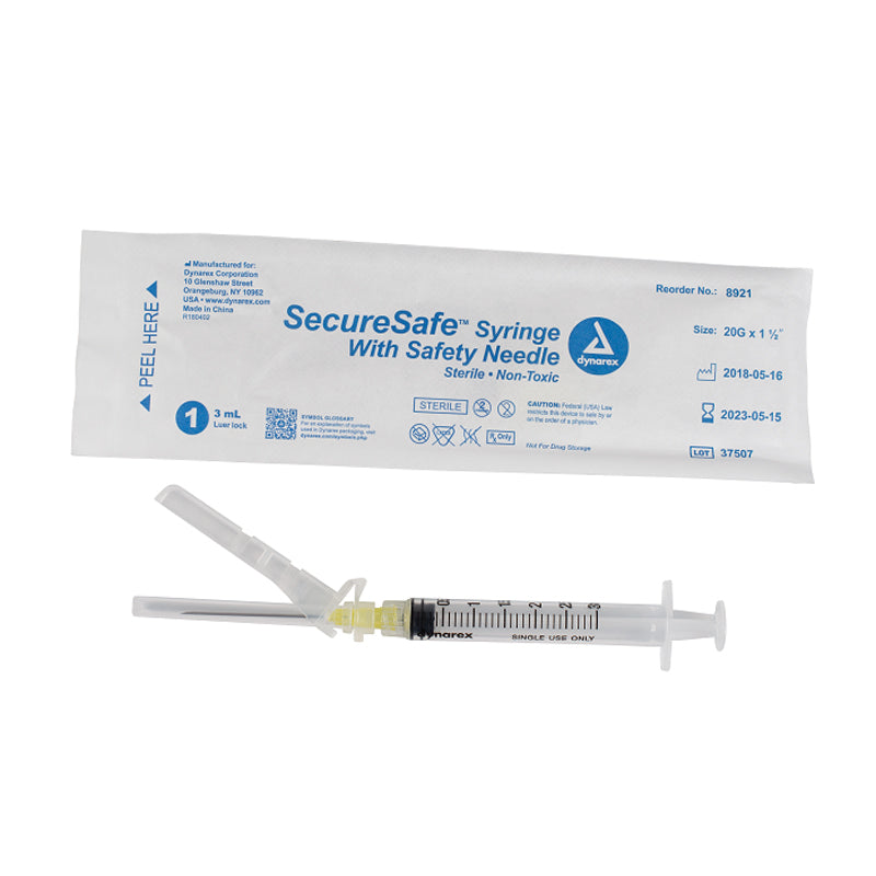 The Dynarex SecureSafe Syringes with Safety Needle are designed with a safety engineered mechanism to provide a comfortable, effective way to deliver medication or draw blood, while protecting the users from accidental needlesticks.