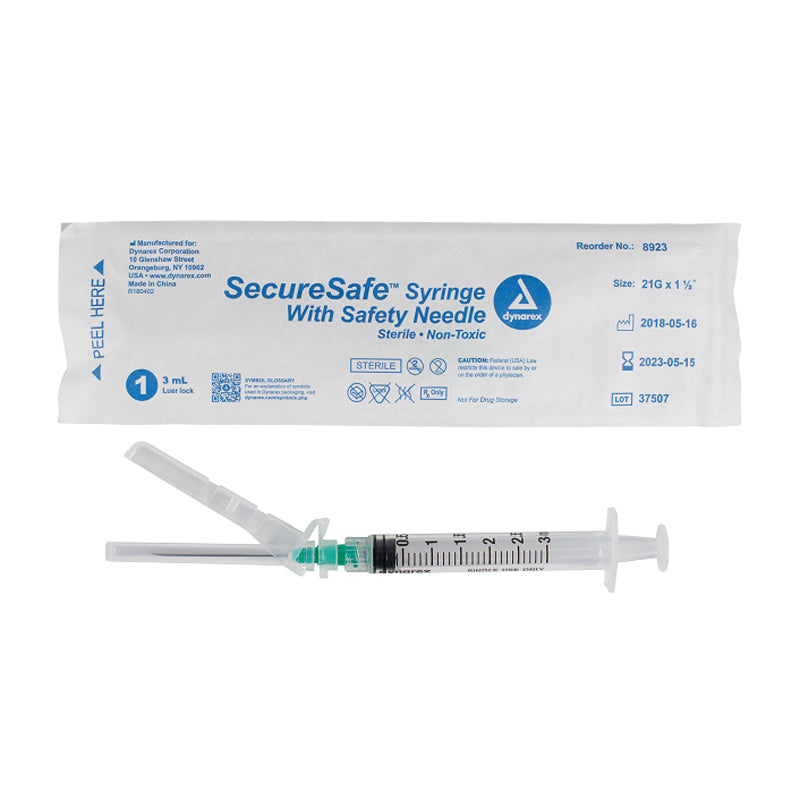 The Dynarex SecureSafe Syringes with Safety Needle are designed with a safety engineered mechanism to provide a comfortable, effective way to deliver medication or draw blood, while protecting the users from accidental needlesticks.