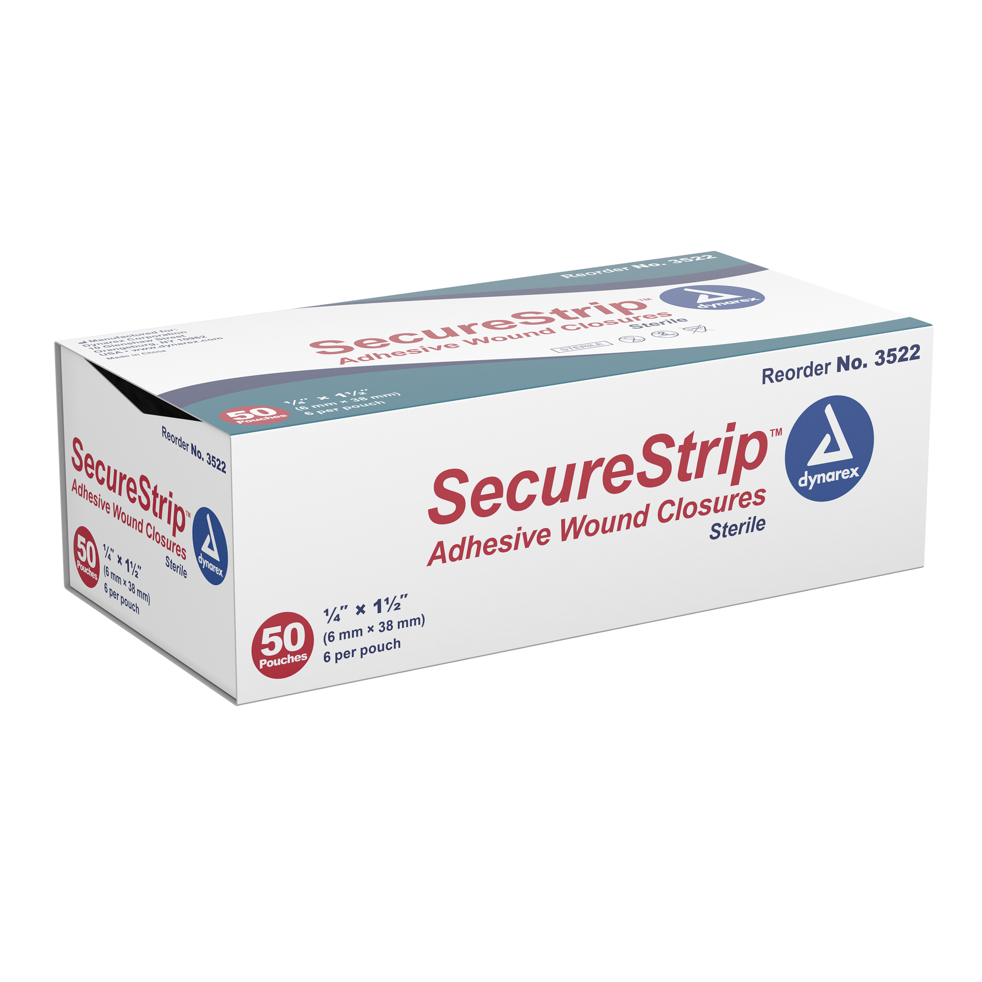 Dynarex Secure Strip Sterile Adhesive Wound Closure Strips are manufactured of a flexible non-woven material, which provide a secure wound closure using a skin friendly adhesive to minimize skin shearing or blistering. The Adhesive Strips allow maximum porosity and vapor transmission for rapid healing.