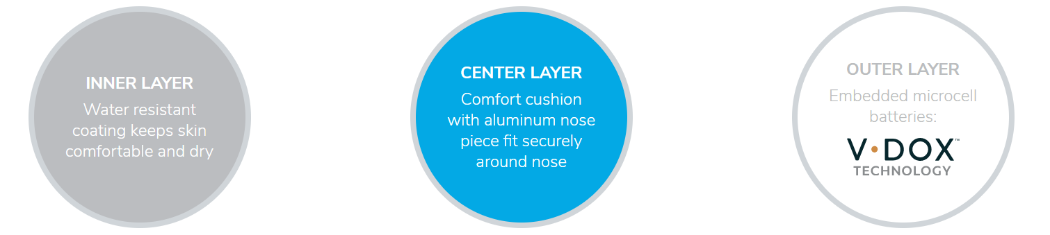 The inspiration for innovation lay in the proprietary V.Dox™ Technology. Our mission has always been to revolutionize infection control through the delivery of microcell battery-powered electricity. So, when the COVID-19 public health emergency revealed a critical shortage in personal protective equipment (PPE), we knew we needed to broaden our focus. We immediately began design and development work on face masks to help prevent the spread of SARS-CoV-2, the virus that causes COVID-19. Our innovation is represented in the only mask of its kind— the Vomaris Face Mask with V.Dox Technology.